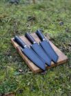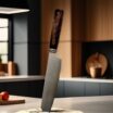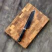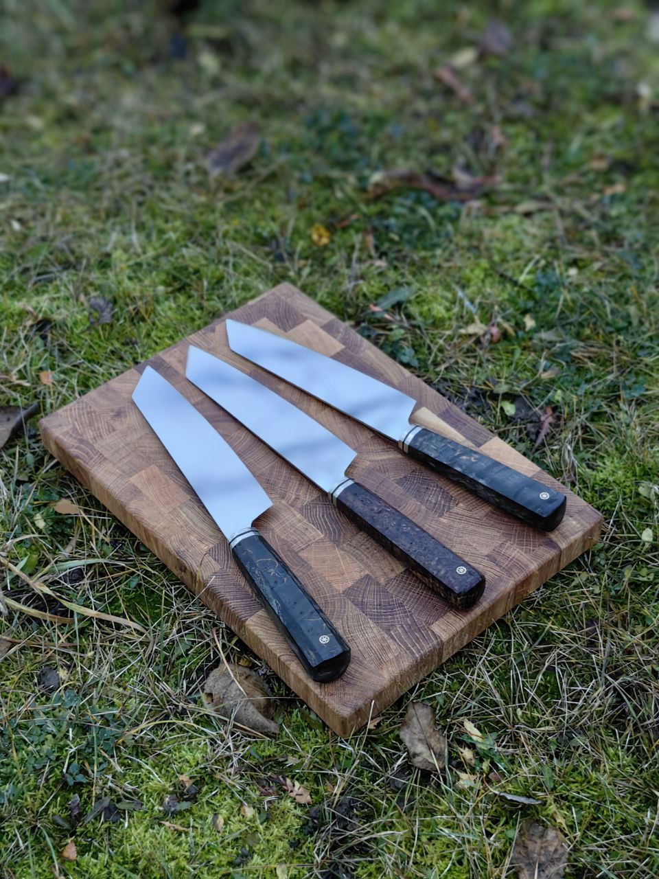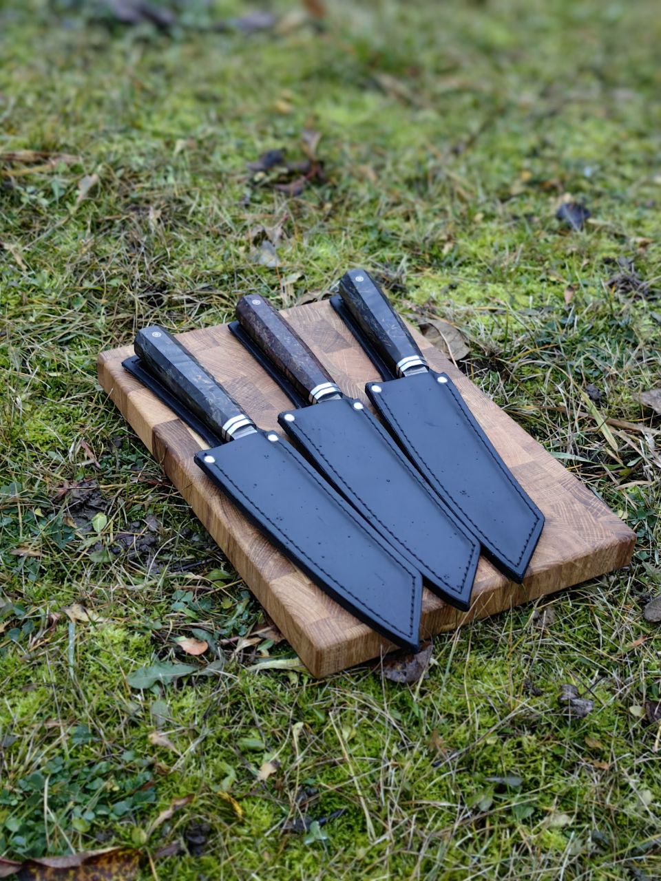 Большой шеф нож в стилей японского Bunka из премиальной стали. N690 — топовая австрийская нержавеющей сталь, с отличными режущими характеристиками. Рукоять ножа выполнена из стабилизированной карельской берёзы со вставками из мельхиора и пином. В комплекте идут ножны из натуральной кожи.