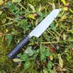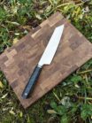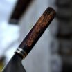 Большой шеф нож в стилей японского Bunka из премиальной стали N690. Рукоять ножа выполнена из стабилизированной карельской берёзы со вставками из мельхиора и пином. В комплекте идут ножны из натуральной кожи.